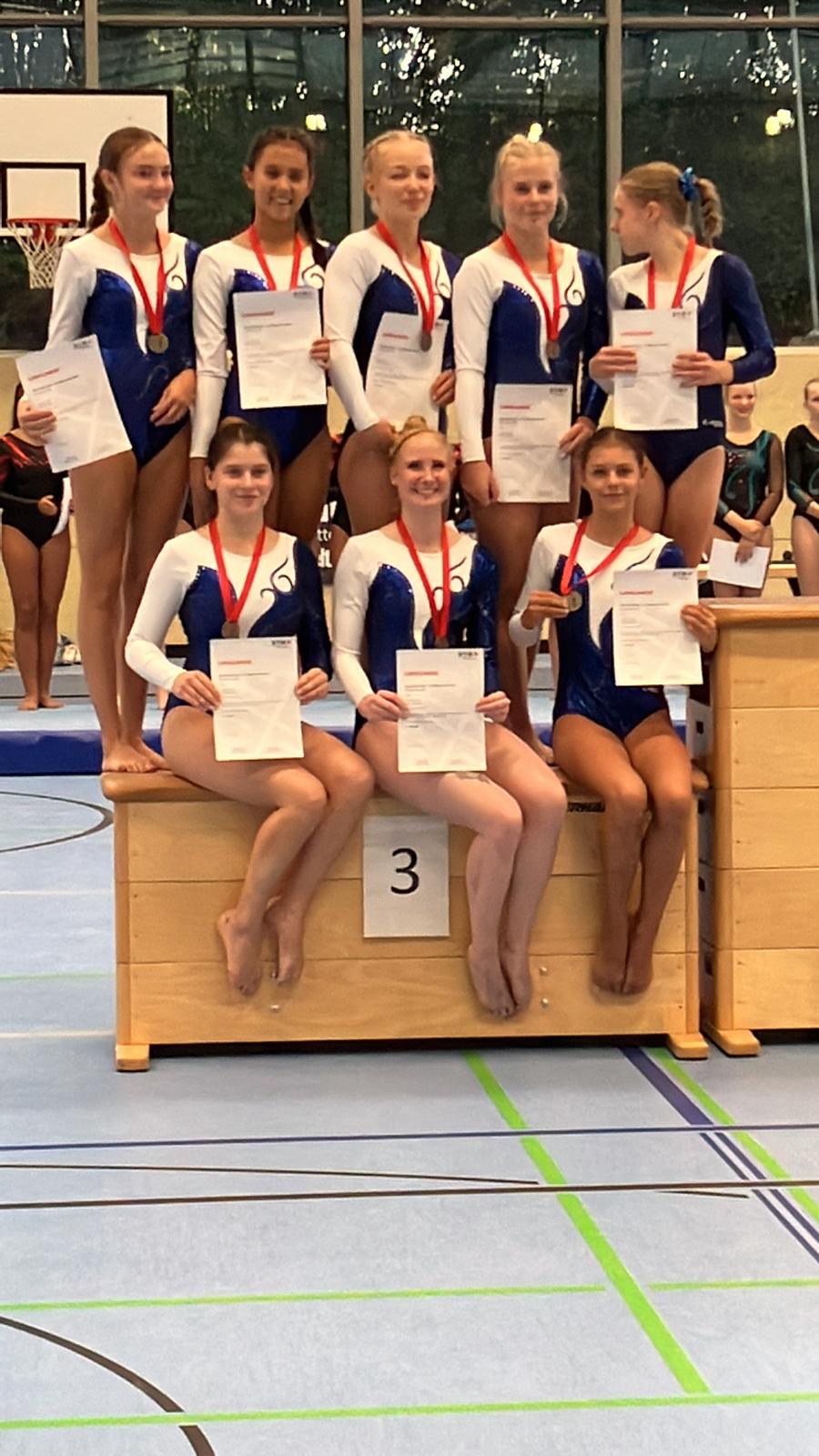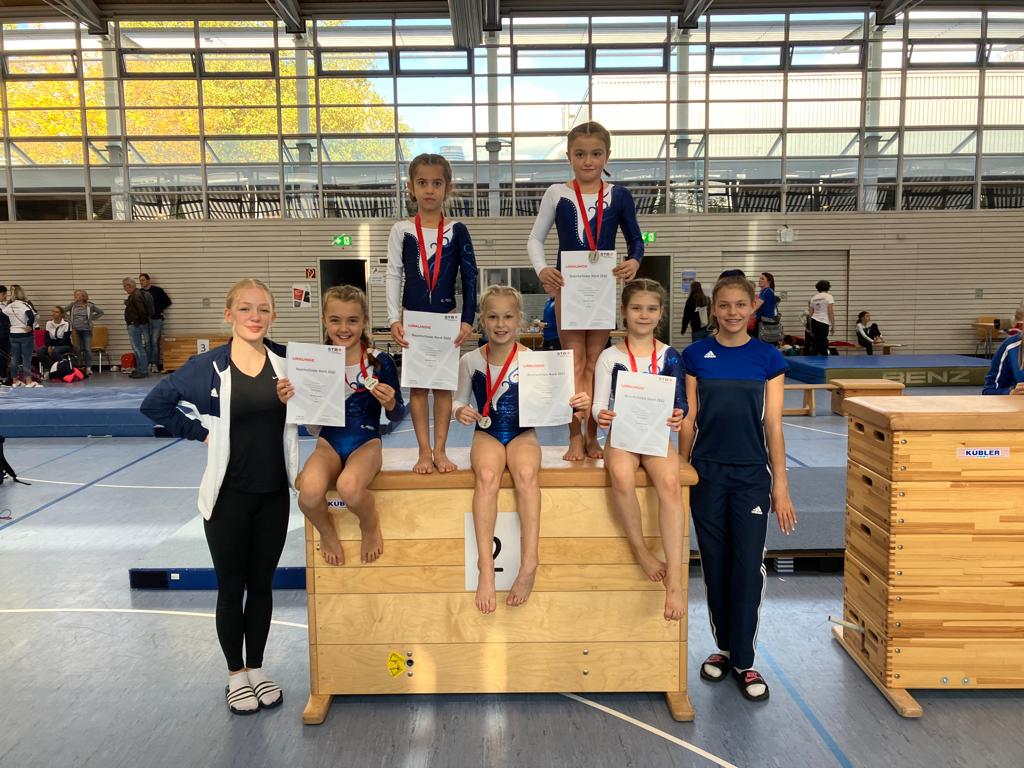 Ähnliches gelang den Kür-Turnerinnen zwei Wochen zuvor in deren Bezirksfinale. Mit ebenfalls nur 0,5 Punkten Rückstand auf Platz 2 sicherten sie sich den 3. Platz und somit den Einzug ins Landesfinale. Anders als die E-Jugend-Mädchen legten die Kür-Turnerinnen den Grundstein für den Einzug gleich am 1. Gerät: dem Schwebebalken. Mit 33,3 Punkten erreichten sie dort das zweitbeste Geräteergebnis des Wettkampfs. Gleiches gelang am Sprung. Am Stufenbarren und Boden ließen sie im Vergleich zur Konkurrenz ein paar Punkte liegen und erturnten sie sich am Ende bei 11 gestarteten Mannschaften einen Podestplatz und damit die Qualifikation für das Landesfinale. Zur Mannschaft gehören Eyelyne Balyschew, Kira Bühler, Leni und Nele Bürkle, Paula Kohl, Joya Molina, Amelie Sabljic und Sabrina Weiss.