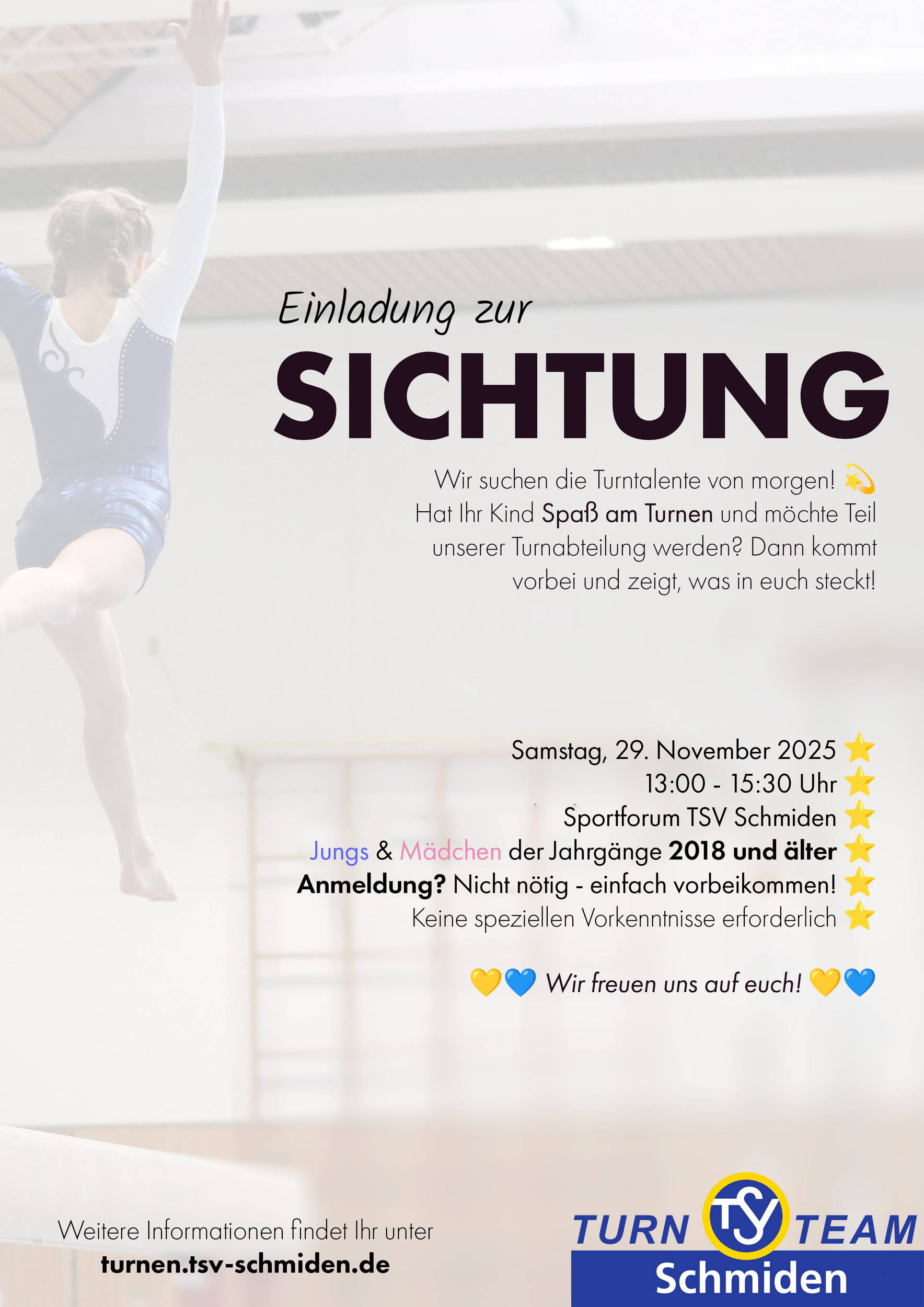 Das Sichtungstraining richtet sich an Jungs & Mädchen der Jahrgänge 2018 und älter, die Interesse daran haben, Teil unserer Turnabteilung zu werden. Es ist keine Anmeldung erforderlich – kommen Sie einfach vorbei!