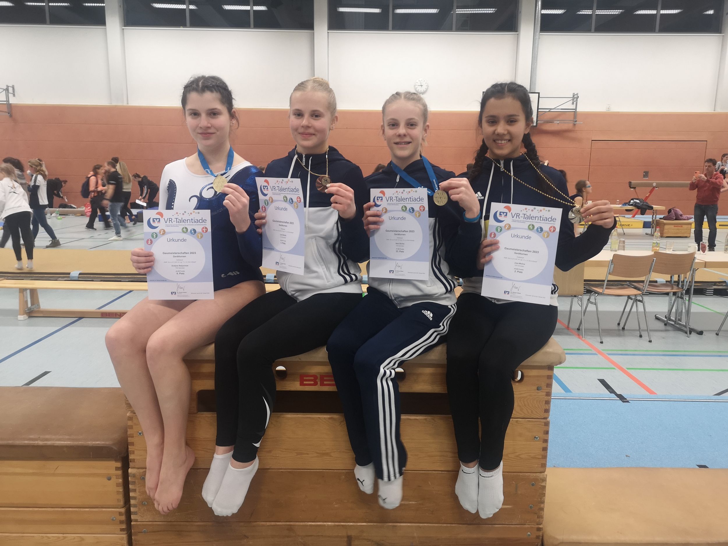 Am Sonntag folgte noch ein Rahmenwettkampf: In der B-Jugend (Jg.09/08) wurde Josefine Limbrunner 8. Dann folgten die Meisterschaftswettkämpfe. In der E-Jugend im Jahrgang 2015 belegte Emily Campana mit knapp 54 Punkten einen hervorragenden 2. Platz, Pauline Celestine Biedermann wurde 7., Olivia Tadic 8. Noch besser lief es für die Turnerinnen aus Schmiden im Jahrgang 2014: Leonie Vogel sicherte sich knapp vor Vivienne Lenz den Meistertitel. Mia Avramidou wurde 14. Rebecca Pimenta Schoell komplettierte mit ihrem 3. Platz in der C-Jugend (Jg. 11) den Medaillensatz. Kira Bühler steuerte als Zweitplatzierte, bei 35 Teilnehmerinnen in der offenen Klasse, eine weitere Silbermedaille bei. Aufgrund ihrer hervorragenden Platzierungen haben sich Emily, Leonie, Vivienne, Rebecca und Kira einen Startplatz im Bezirksfinale gesichert! Herzlichen Glückwunsch und viel Erfolg am 13. Mai in Ellhofen!