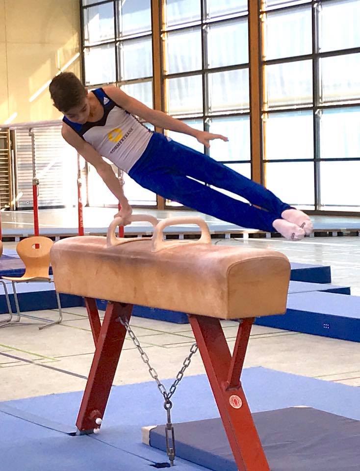 Danach das Zittergerät der Turner, das Pauschenpferd. Im ersten Duell kam Emilian von dem Bussche kurz vor dem Abgang ins Straucheln, wodurch dieser nicht gewertet wurde und der Schömberger Jan Dreher die ersten 5 Scorepunkte für seine Mannschaft holte. Doch die Antwort folgte schnell. Der 14-Jährige Philip Buchner kämpfte sich durch die Übung und gewann einen Punkt. Darauf folgten der routinierte Hansi Lohr mit 5 Punkten und Dimitrios Rimenidis mit 3 Punkten. „Dimi“ musste dabei sogar kurzzeitig das Gerät verlassen, gegen die hervorragende Technik und hohe Schwierigkeit des TSV-Athleten, kam sein Gegner dennoch nicht an.