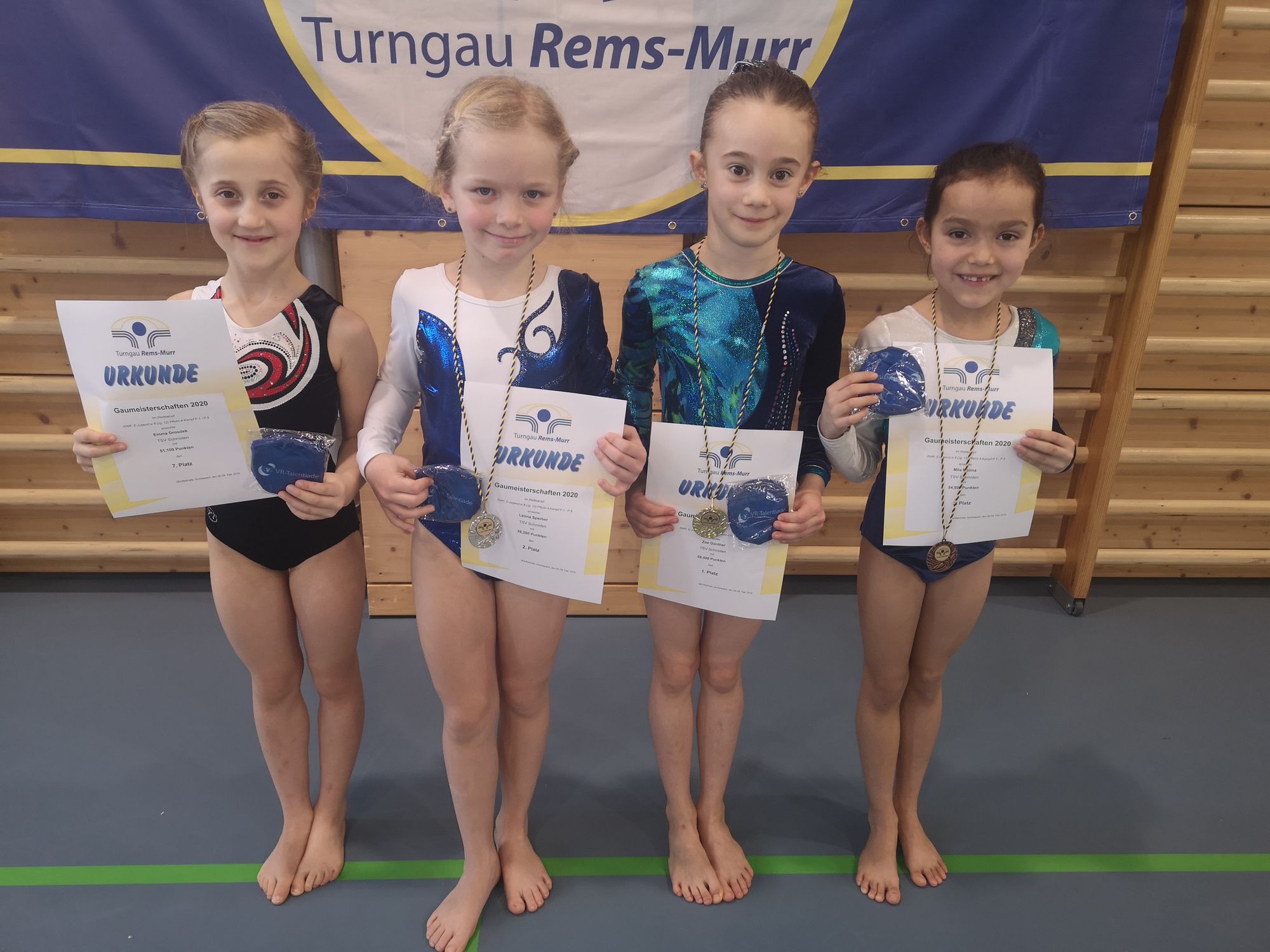 Mit den Kleinsten begann das Wettkampfwochenende: Rahmenwettkampf E-Jugend (Jahrgang 2012) - und sie konnten gleich ein Zeichen setzen. Die Plätze 1-3 gingen nach Schmiden: Zoe Günther sicherte sich die Goldmedaille, dicht gefolgt von Leona Sperber auf Platz 2 und Mila Molina, die sich Bronze erturnte. Emma Drosdek auf Platz 7 rundete das gute Mannschaftsergebnis ab.