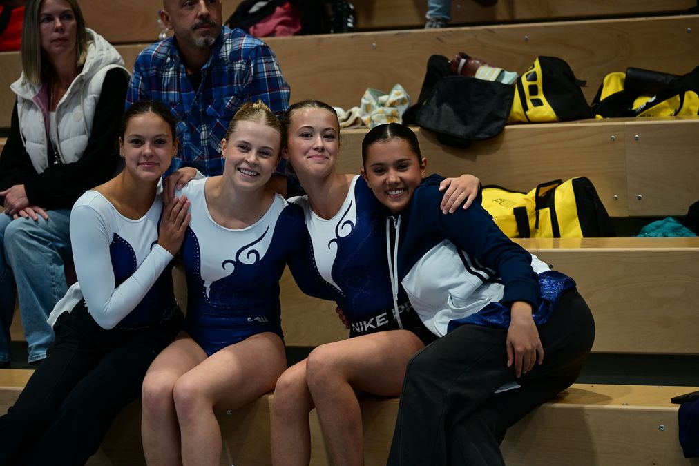 Los ging es am Samstagmorgen mit dem Kür-Vierkampf im RWK Code de Pointage+, der höchsten Klasse des Rahmenwettkampfes. Für unser Ligateam traten Leni Bürkle, Paula Kohl, Isabel Met, Joya Molina und Rebecca Pimenta Schoell an. In einem hochklassig besetzten Wettbewerb lag der Fokus vor allem darauf, neue Elemente auszuprobieren und wieder Wettkampferfahrung zu sammeln. Am Ende belegte das Team einen soliden 4. Platz.