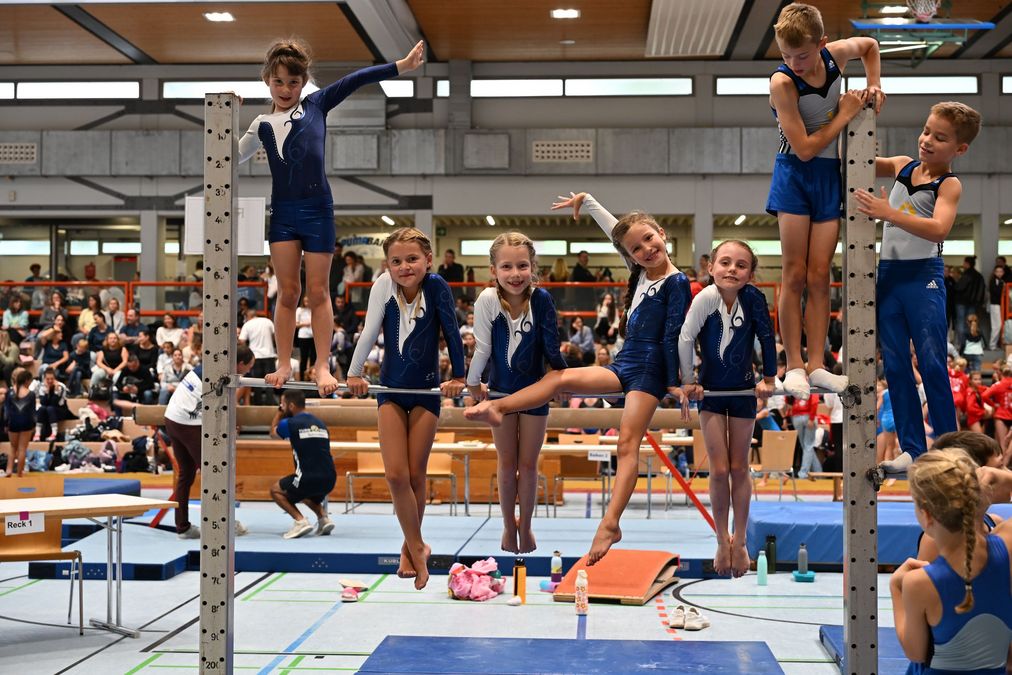 Anschließend waren unsere jüngsten Turnerinnen gefragt: In der F-Jugend (Jahrgang 2018) gingen Jara Heckert, Rosa Laible sowie Helena und Johanna Wurster an die Geräte. Für einige war es der erste richtige Wettkampf – entsprechend aufregend war der Tag. Die Mädchen turnten an Sprung, Reck, Balken und Boden Übungen der P3 bis P5 und erreichten gemeinsam einen guten 6. Platz.