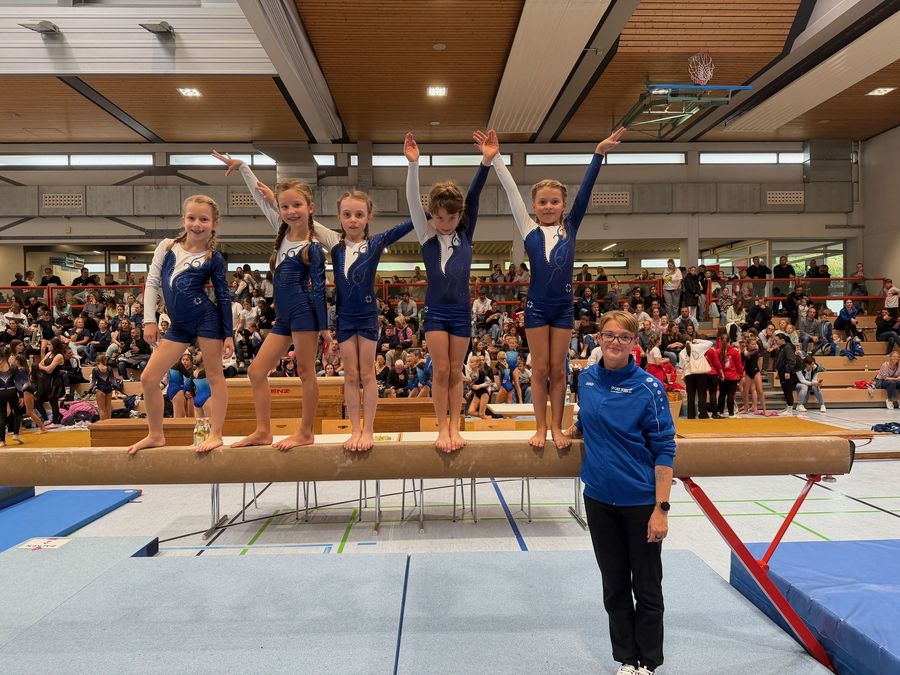 Selma Maria Bürkle, Lotta Heigemeir, Alina Hoffmann, Anastasia Junghans und Cara Wiesner. Trotz des Altersunterschieds zu den teils zwei Jahre älteren Konkurrentinnen zeigten alle Mädchen tolle Leistungen. Besonders stark war das Team am Reck, wo alle Turnerinnen Wertungen über 14 Punkte erzielten. Die Mädchen präsentierten P5-Übungen an allen Geräten und steigerten sich im Vergleich zu früheren Wettkämpfen deutlich. Am Ende belegten sie Platz 7 – für das Bezirksfinale reichte es damit leider nicht, aber die Entwicklung ist deutlich sichtbar und vielversprechend.